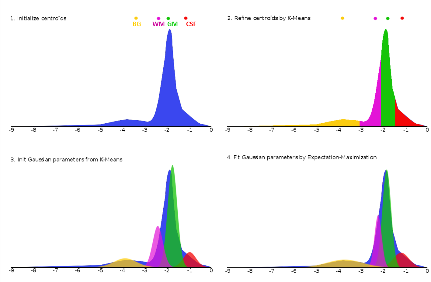 A first 4-classes mixture is fitted to the MRI histogram. Log-transformed intensities are first normalized with a translation of the histogram so that the maximum value in the image is 0. This way, pre-computed centroids values can be used to initialize the fitting process as close as possible to the true centroids. Centroids are first refined by K-means segmentation. Results from the K-means are then used to initialize the parameters (mean, variance, global proprortion) of a 4-class gaussian mixture model which is fitted by expectation-maximization (Figure 2).
