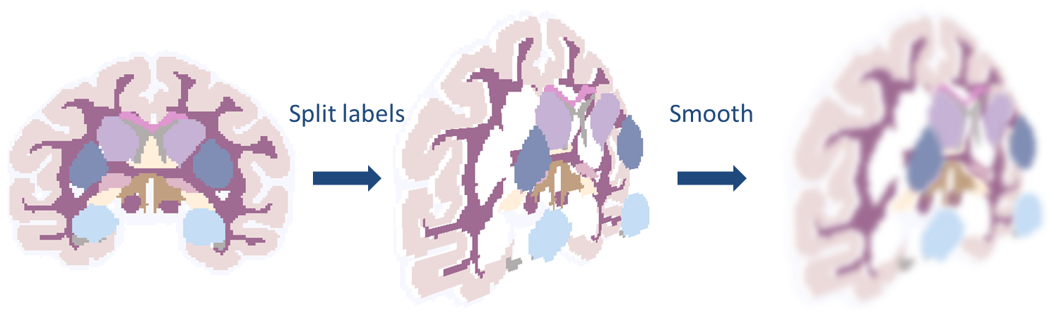If the atlas used is not probabilistic (i.e. it is a volume of labels), it is first "probabilized" by creating one 3D volume for each label, which yields a binary 4D volume, and by smoothing the resulting masks (Figure 1). The smoothing kernel size theorically depends on the quality of the registration and the on the inter-individual variability. In practice, we choose it so that its full-width at half-maximum (FWHM) is 3 times the MRI voxel-size.