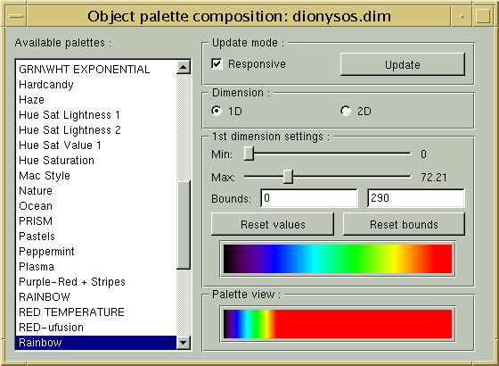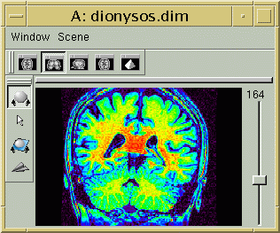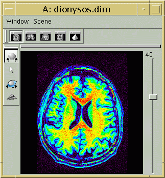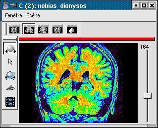 L'image IRM brute et sa version corrigée du biais vont apparaÎtre dans Anatomist dotées d'une table de couleur arc-en-ciel. En jouant sur le réglage de la table de couleur, vous pouvez prendre conscience du biais dans l'image initiale (en général, l'image est plus claire au centre du champ de vue) :