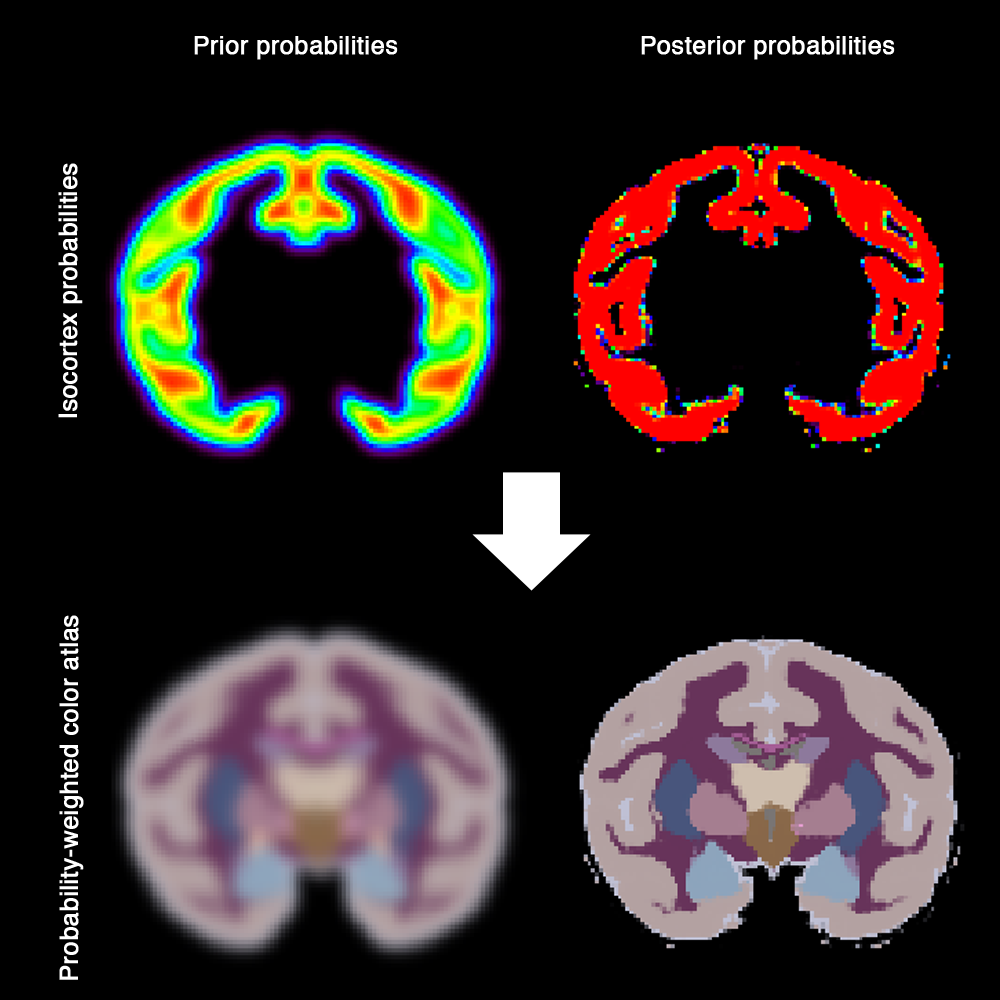 Figure 1. Class probabilities stored in the 4D volume are used to merge the atlas colors with appropriate weights. A voxel with a probability of 1 to belong to class isocortex will have th same color as in a segmentation. A voxel with probabilities 0.5 to belong to isocortex and 0.5 to belong to white matter will have a color obtained by the merge of the corresponding colors.