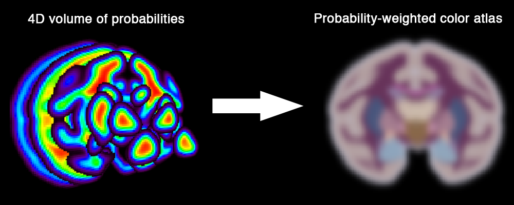 This process converts a 4D volume of probabilities into an atlas-like RGB volume were colors are weighted by class probabilities. This allows to look at all the probabilities at once. It is for visualization purposes only.