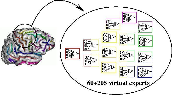 The sulcus recognition amounts to the search for the labelling which maximizes the consensus among the expert assembly. Each expert is a small artificial neural network called multilayer perceptron. Two families of such networks are used. One is in charge of the shapes of the sulci. The second one is in charge of the shapes made up by two neighboring sulci. Hence, the identification of one given sulcus depends on the opinion of several local experts: one in charge of the sulcus shape and a set of neigbor's experts in charge of the surrounding patterns. This contextual approach can lead to correct labelling even if some experts are wrong. Some analogy with biological models of vision could be discussed. One expert could be viewed as a cortical column, while the congregation has a "corticotopic" organization....