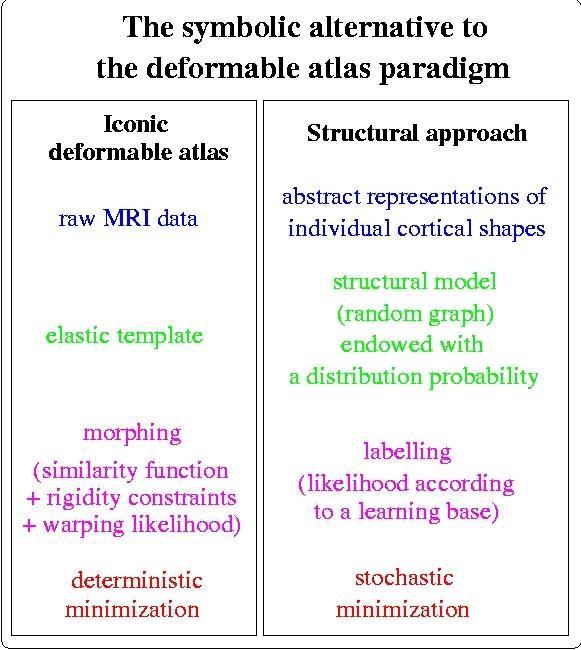 Pour finir, il est intéressant, pour comprendre notre approche, de faire un parallèle avec la méthode concurrente qui consiste à déformer une image modèle dont les sillons ont été identifiés. Dans ce dernier cas, seules les intensités guident les déformations, ce qui conduit parfois à apparier des sillons différents. En fait, la méthode fondée sur des déformations est trop couteuse pour permettre une minimisation de type recuit simulé. On peut donc interpréter des erreurs d'appariement entre sillons comme un blocage dans une vallée pas suffisamment profonde. Notre approche qui travaille à un niveau plus élévé de représentation des formes permet de résoudre ces problèmes. Le modèle n'est plus une image mais une structure probabiliste de type graphe. Les déformations sont remplacées par un étiquetage, ce qui revient à apparier le graphe modèle avec le graphe représentant le nouveau cerveau.