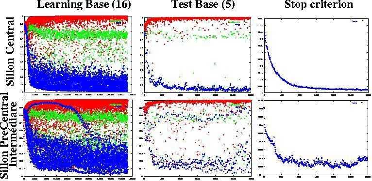 the charts above give a few examples of the evolution of the mean error during the learning. When the sulcus shape is simple like for central sulcus, the learning is fast and the generalization almost perfect. When the pattern to be learned is more variable, like for intermediate precentral sulcus, the generalization does not work for each example. In such cases, the networks in charge of the surrounding patterns will provide more knowledge to the system.