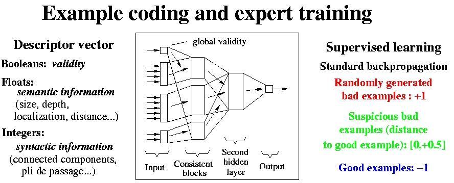 The training of one given expert consists in presenting alternatively correct and non correct examples of the pattern that has to be learned. The network is supervised during this learning. Little by little, the network learns to provide a low answer (around zero) for correct examples, and a high answer (around 1) for non correct ones. To check if the network can generalize this knowledge, a second learning database is used. This checking is performed from time to time during the learning and leads to stop it when the network begins to learn the first database by heart. Otherwise, the network would lose generalization capacity.