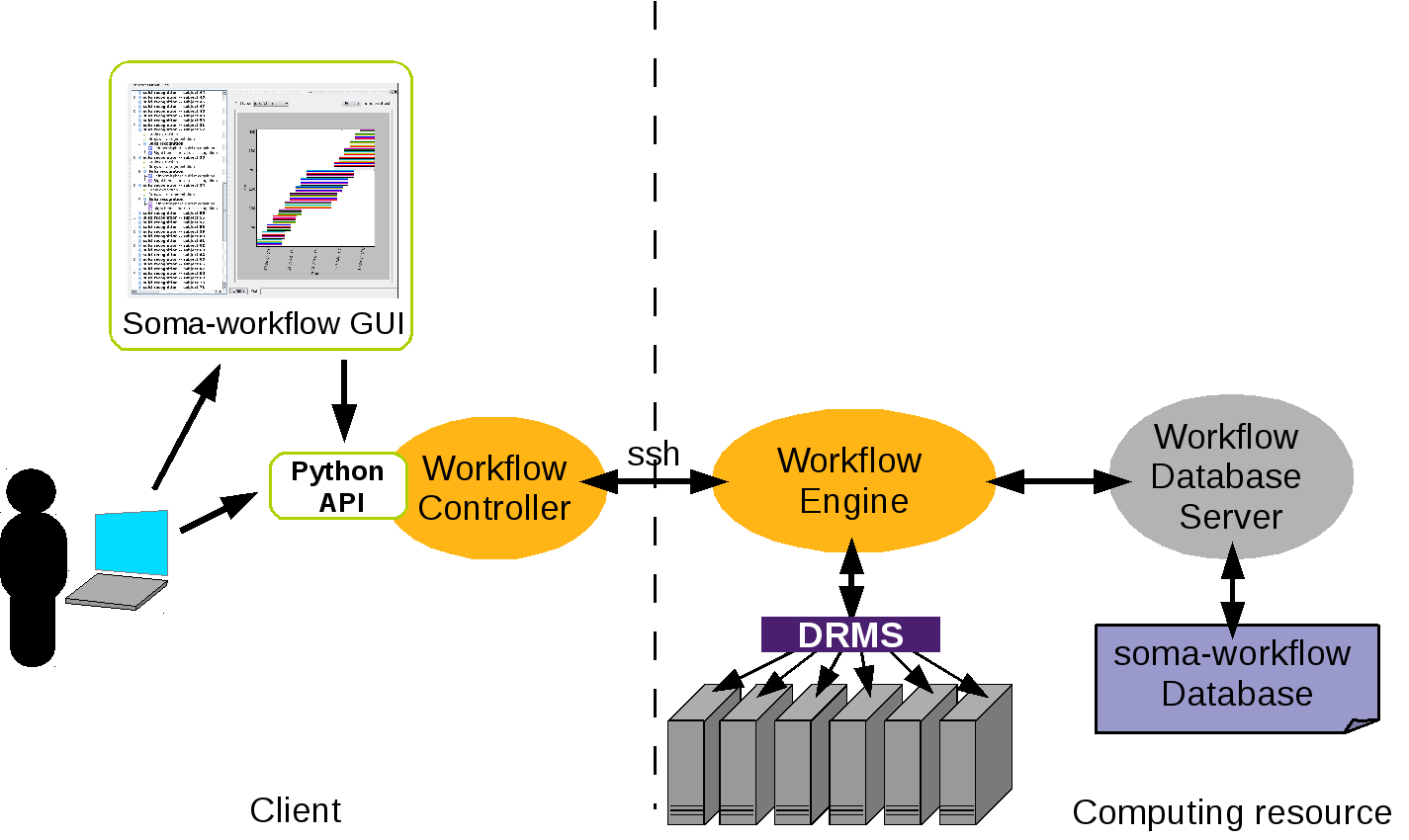 Note that Soma-workflow is not a resource manager it has to interact with the system managing the computing resource (DRMS: Distributed Resource Management System) if it exists.